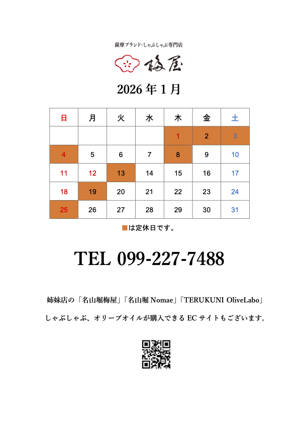 梅屋1月の営業案内です。