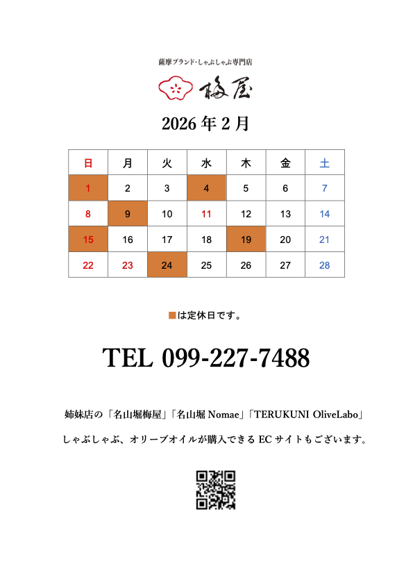 梅屋2月の営業案内です。