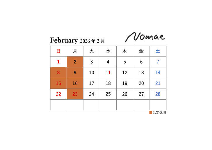名山堀Nomae2月の営業案内です。